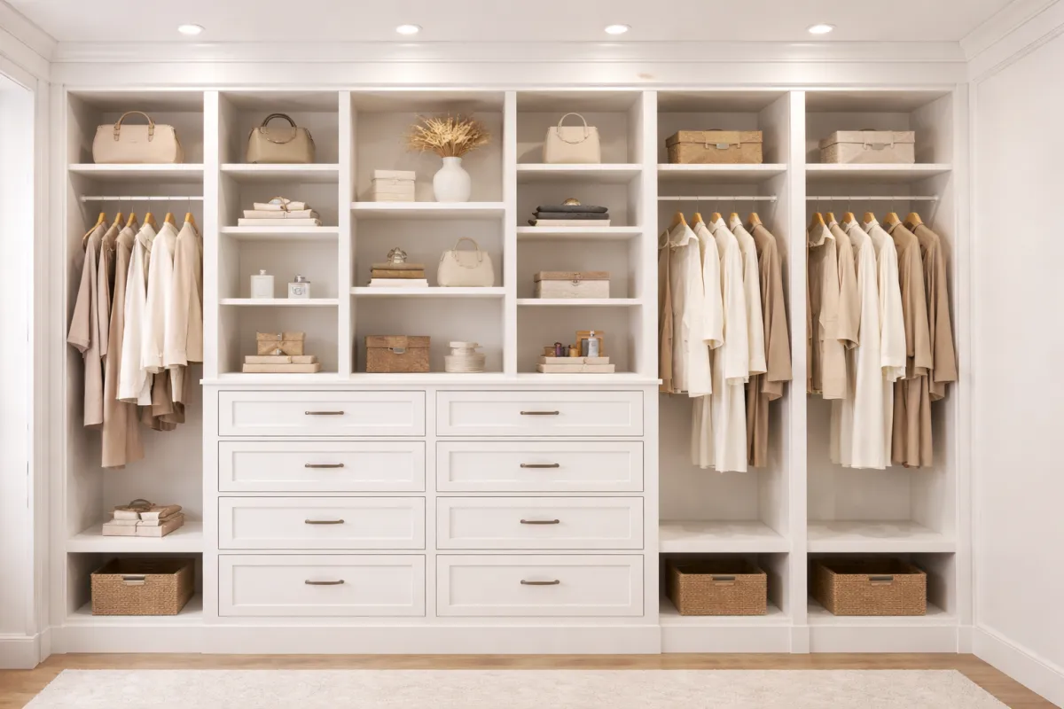 We build custom closet cabinet systems designed to improve organization and everyday functionality. Our closet solutions are tailored to fit your room layout and storage needs.